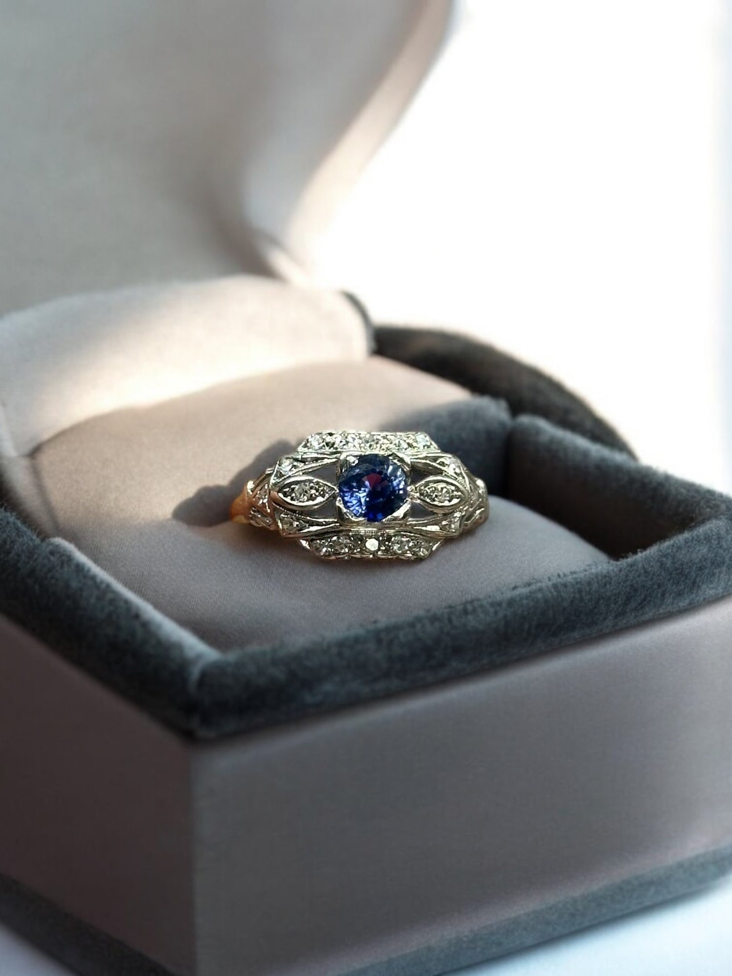 Antique art deco platinum old European cut diamond ring with sapphire accents