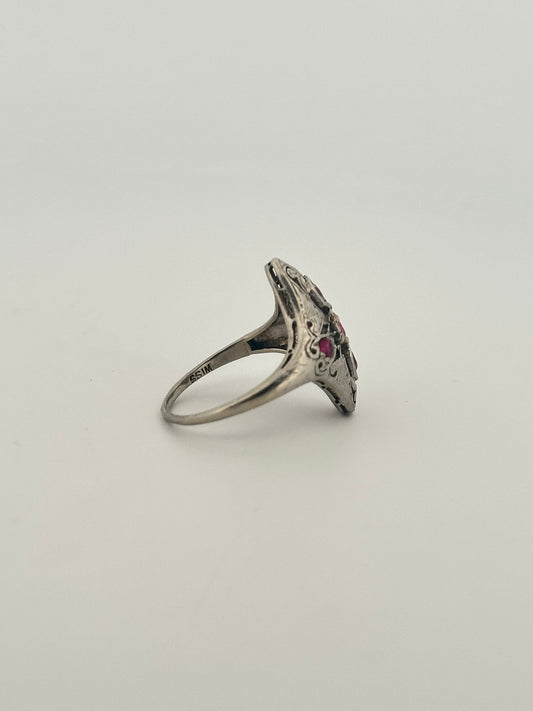 Antique art deco natural old mine cut ruby ring in 18k white gold