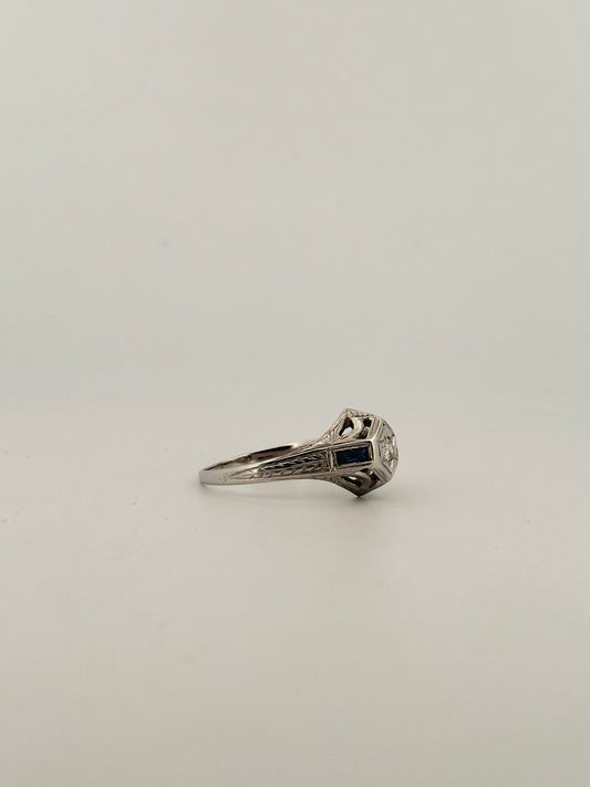 Antique art deco diamond solitaire with sapphire accents in 18k white gold