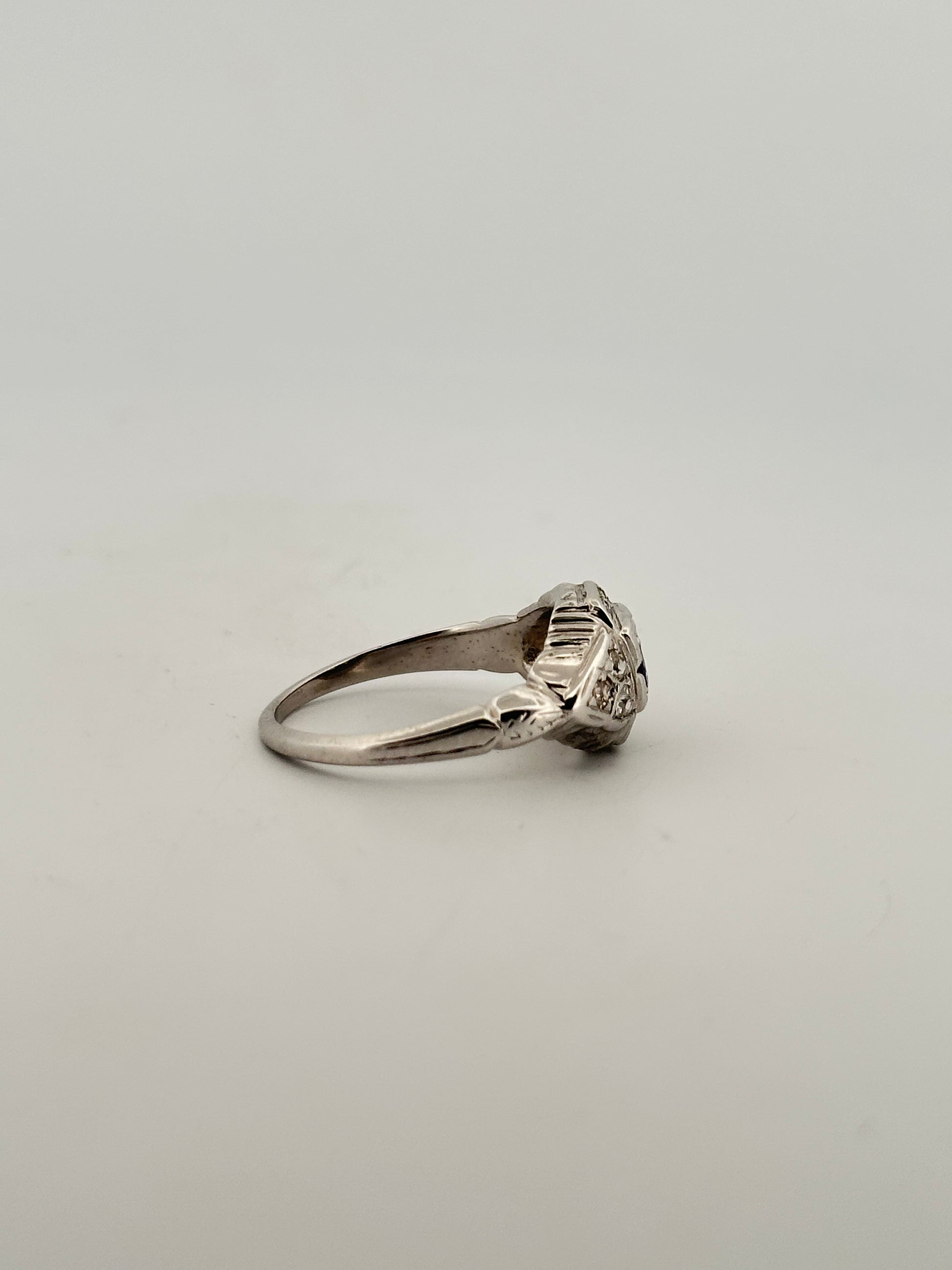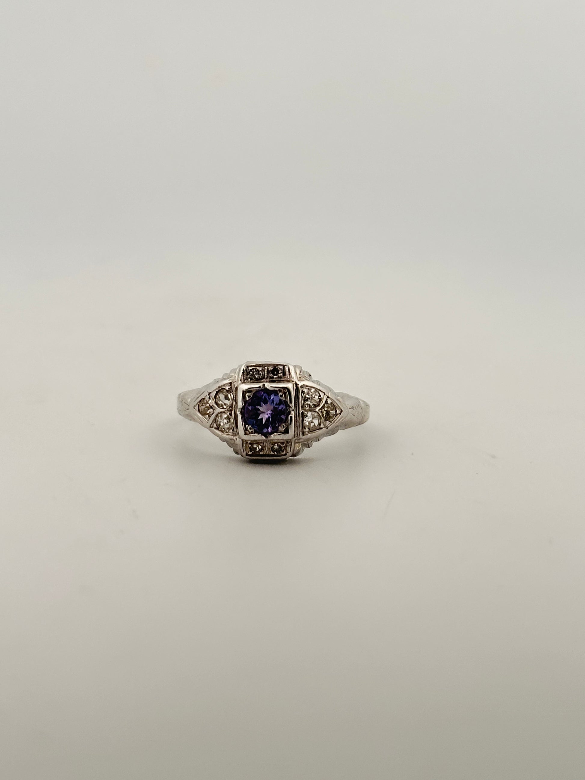 Antique art deco white gold ring with antique old mine cut diamonds and a .30ct (approximately) natural tanzanite center stone.