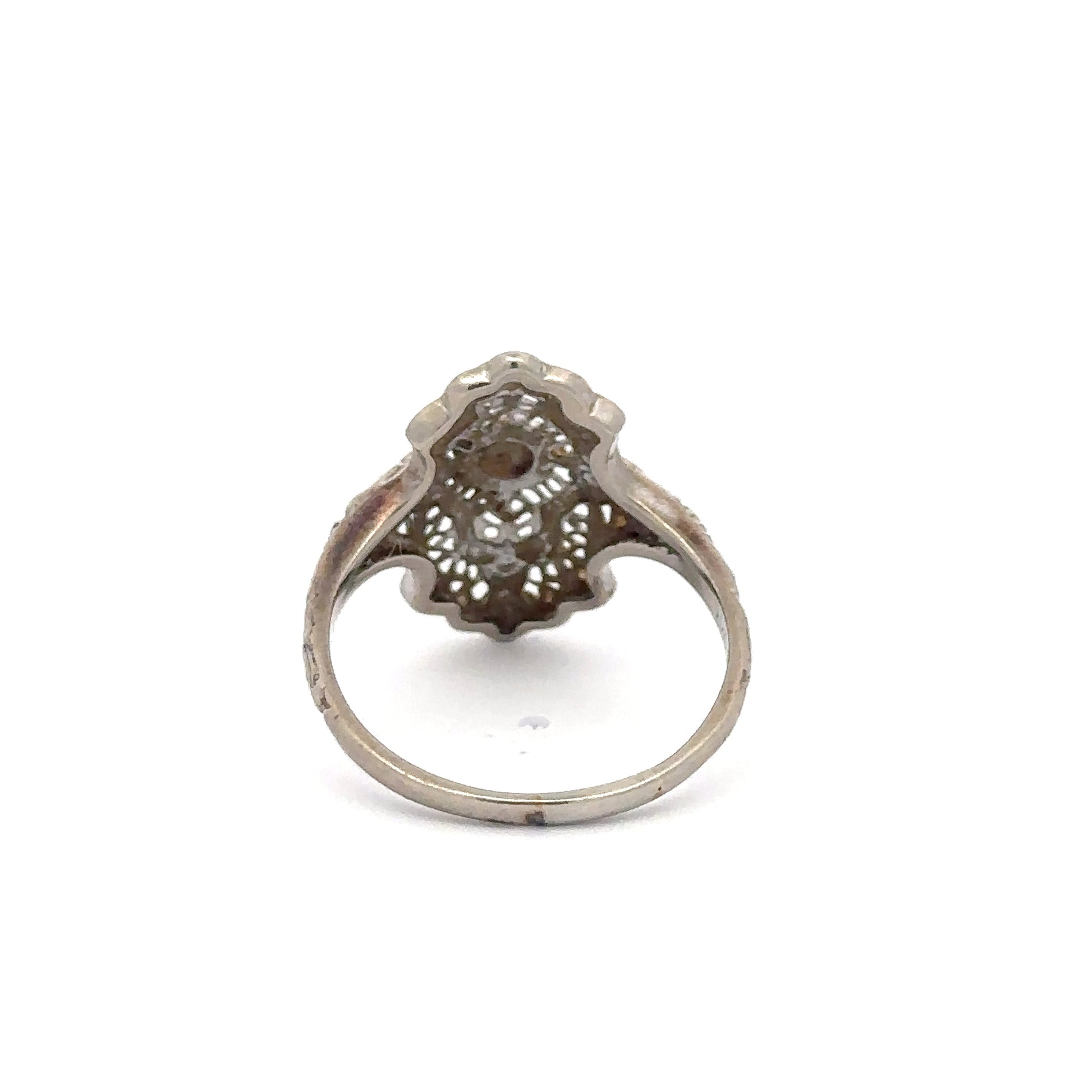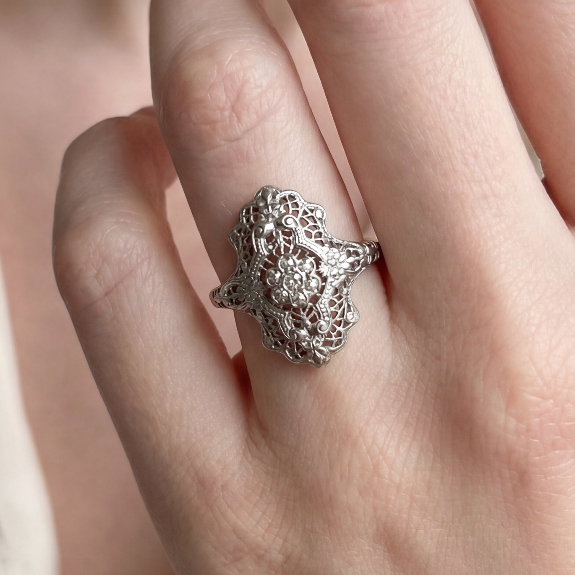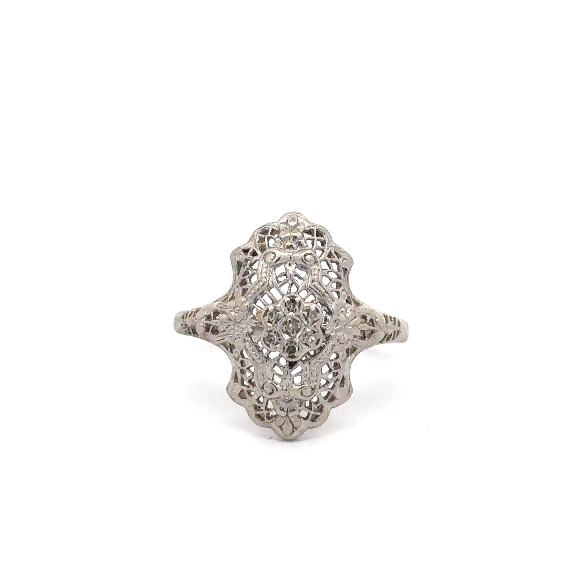 Antique white gold and diamond art deco shield rim featuring natural diamonds set in a stunning iconic filigree shield ring design.