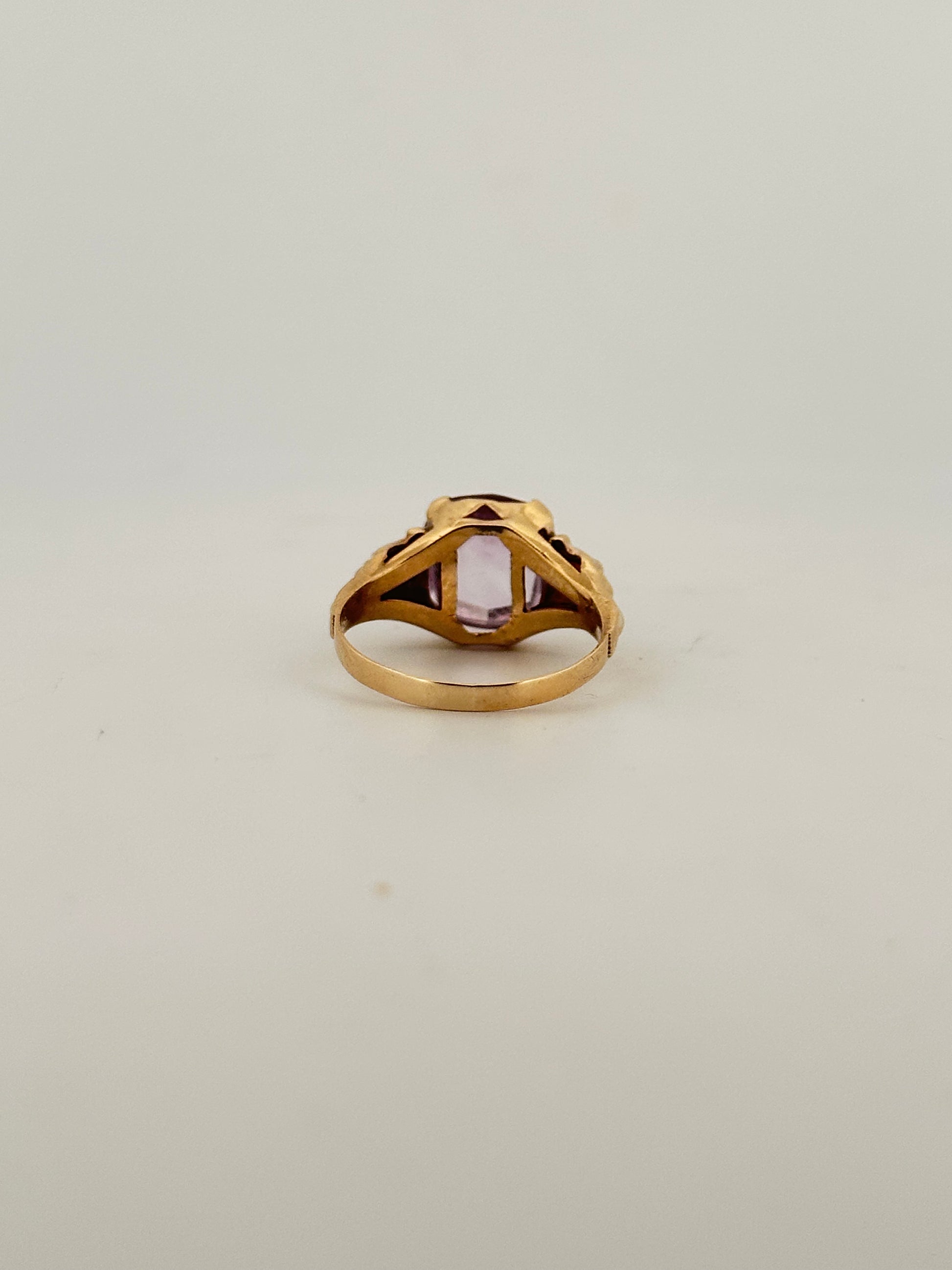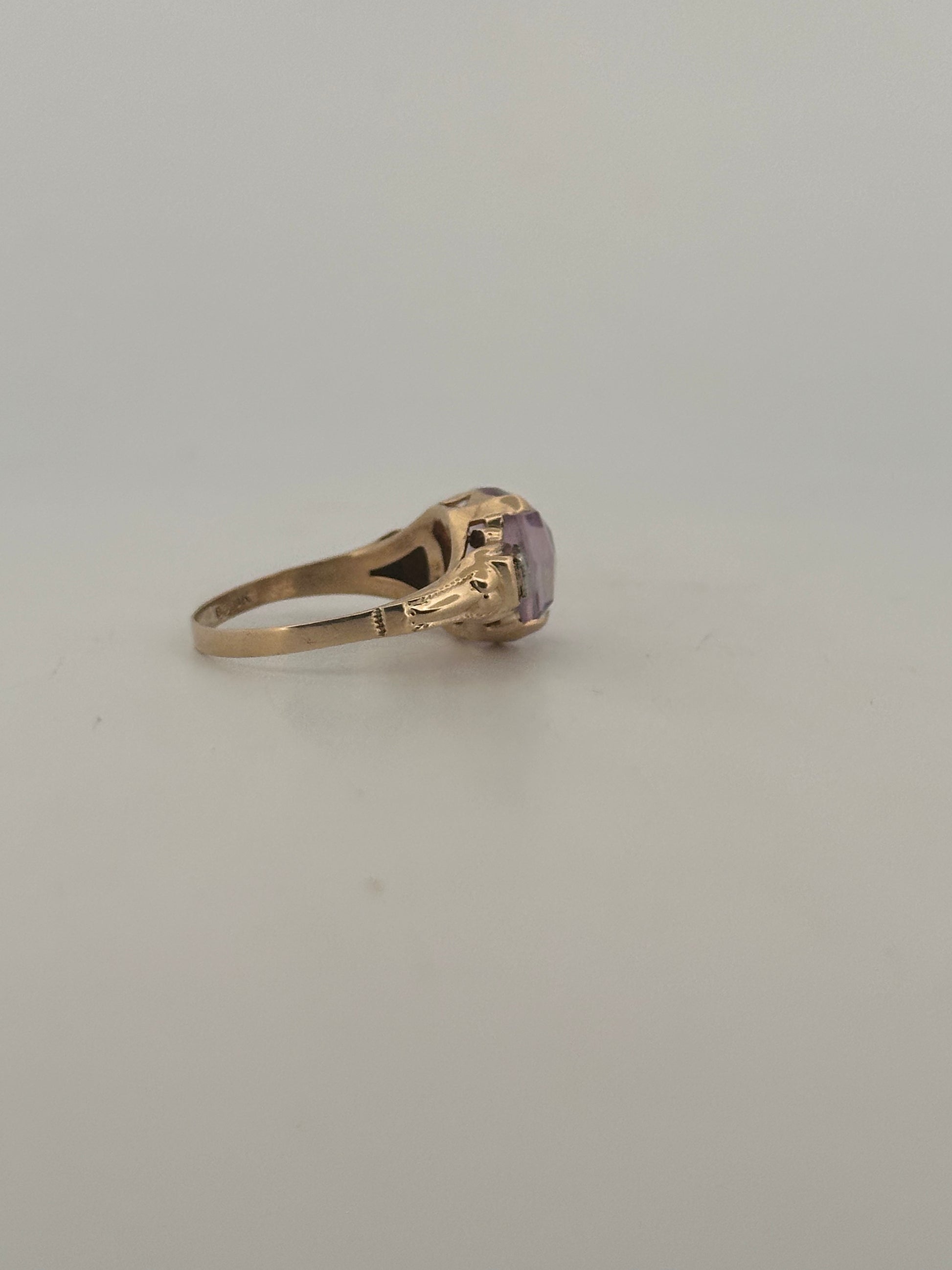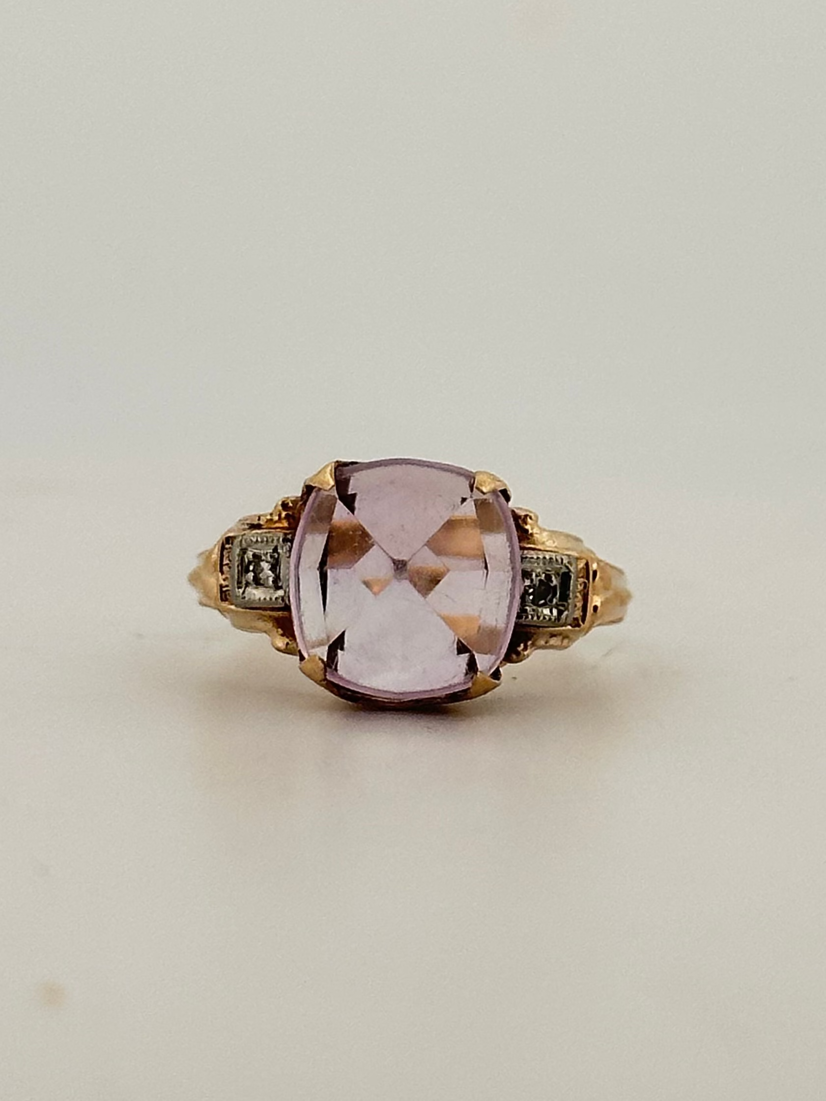 Antique Victorian rose cut amethyst ring in 10k gold with natural diamond accents in white gold bezels atop a yellow gold band