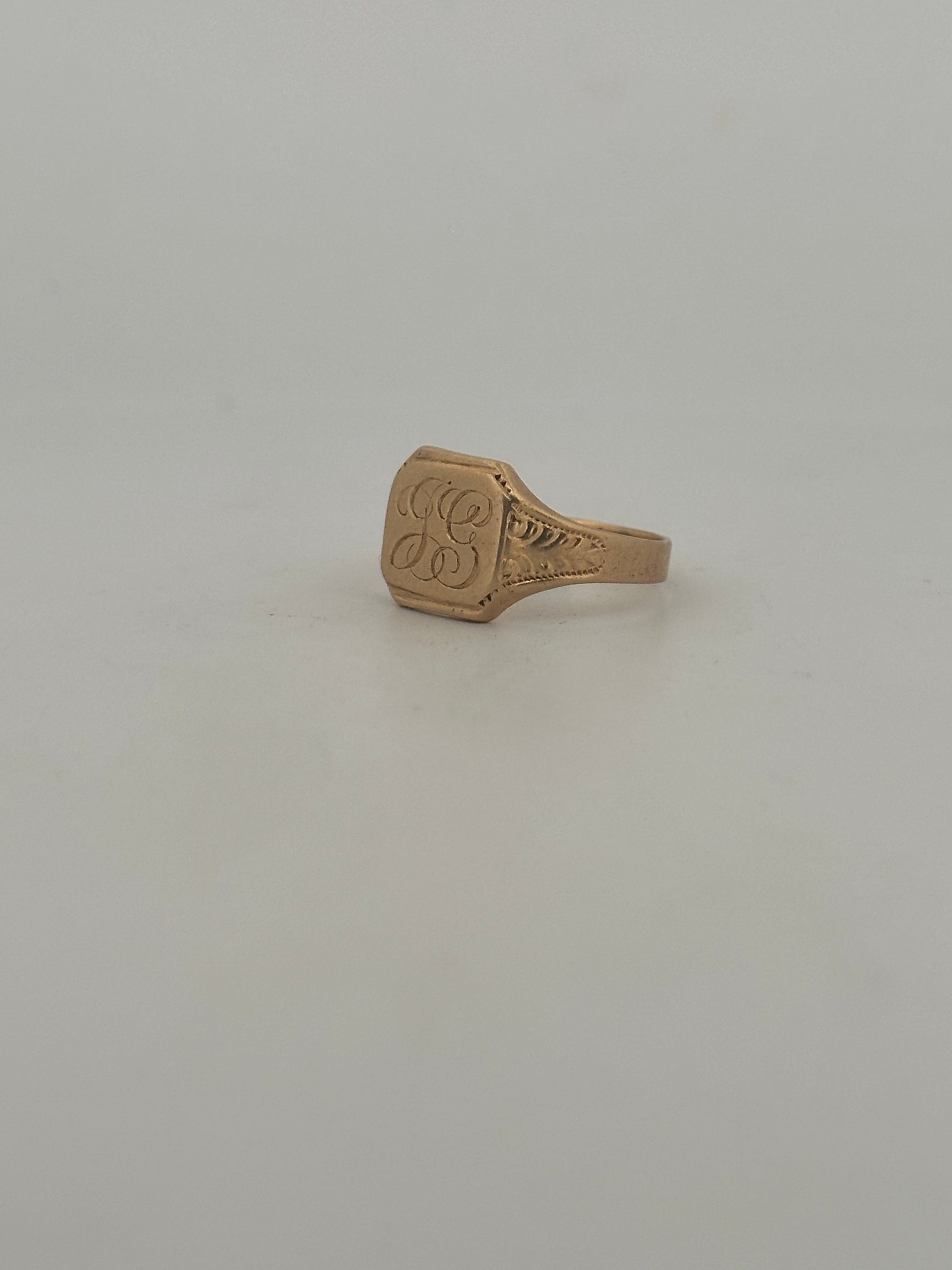 Antique Victorian signet in 14k yellow gold with hand engraved side detail with the initials “JG”