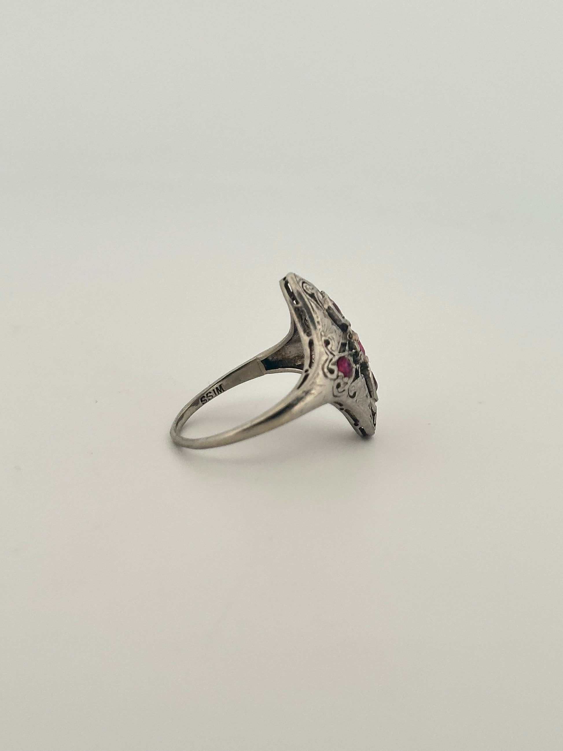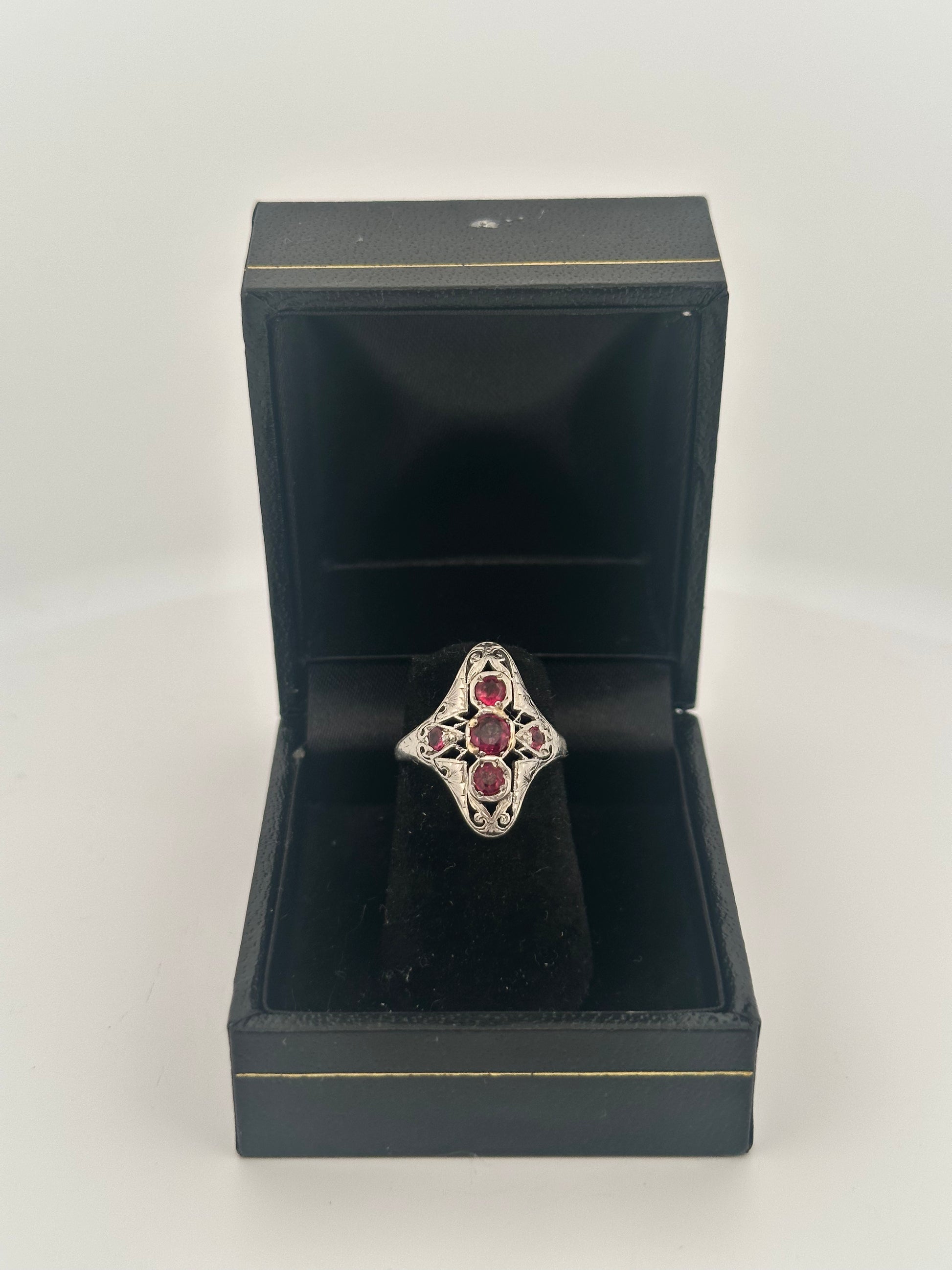 Antique 18k white gold art deco ring circa 1920s with natural old mine cut rubies. Band features stunning hand engraved filigree detailing.