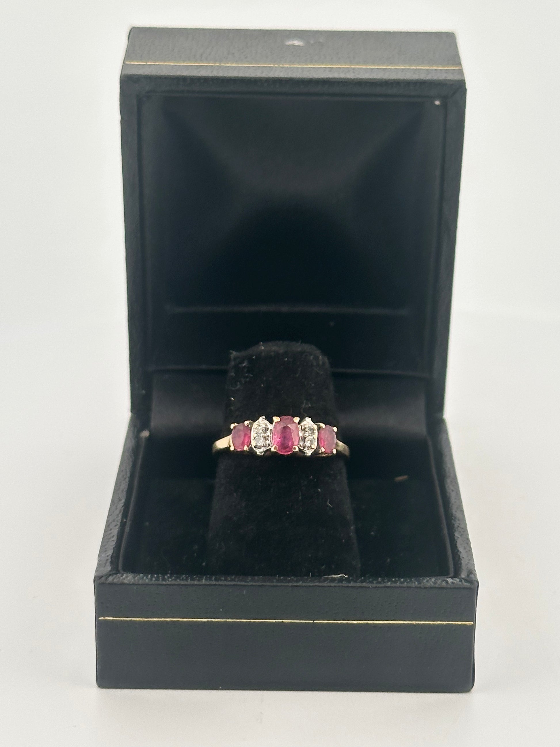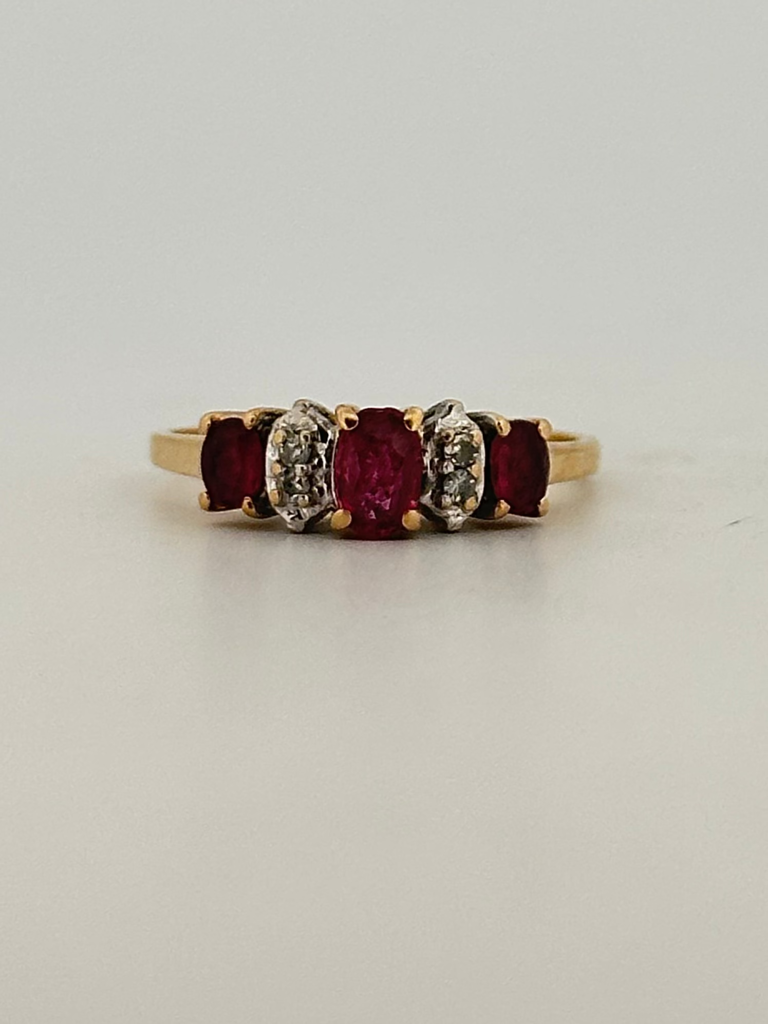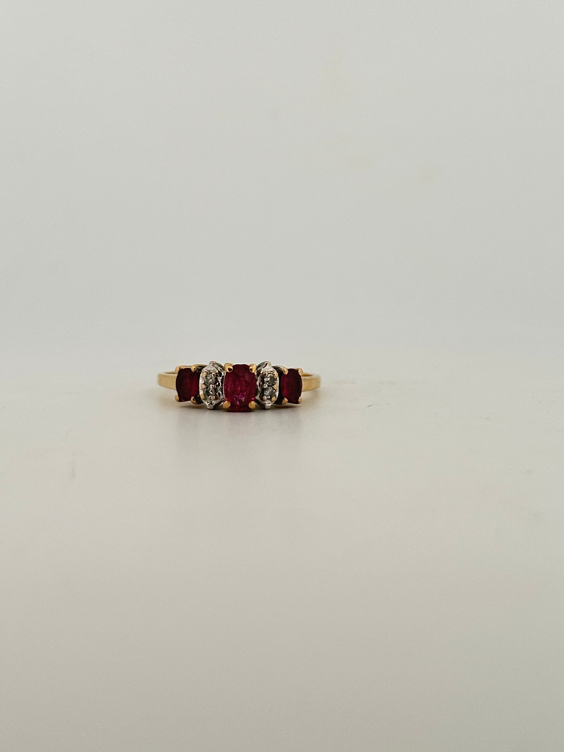 vintage natural ruby and diamond ring in 14k yellow gold. Featuring approximately .60ct of oval cut natural rubies and .20ct of natural diamonds.