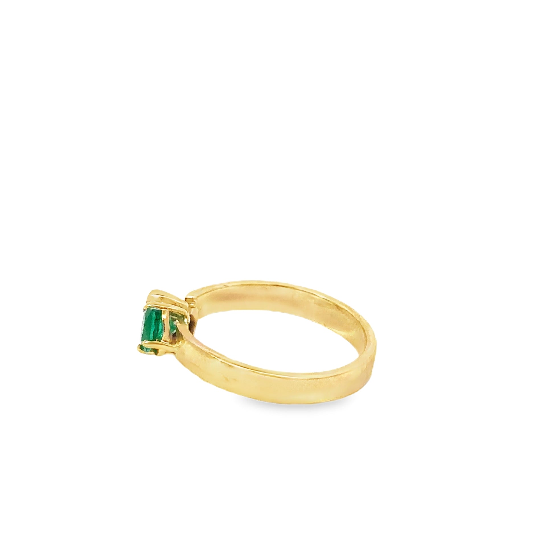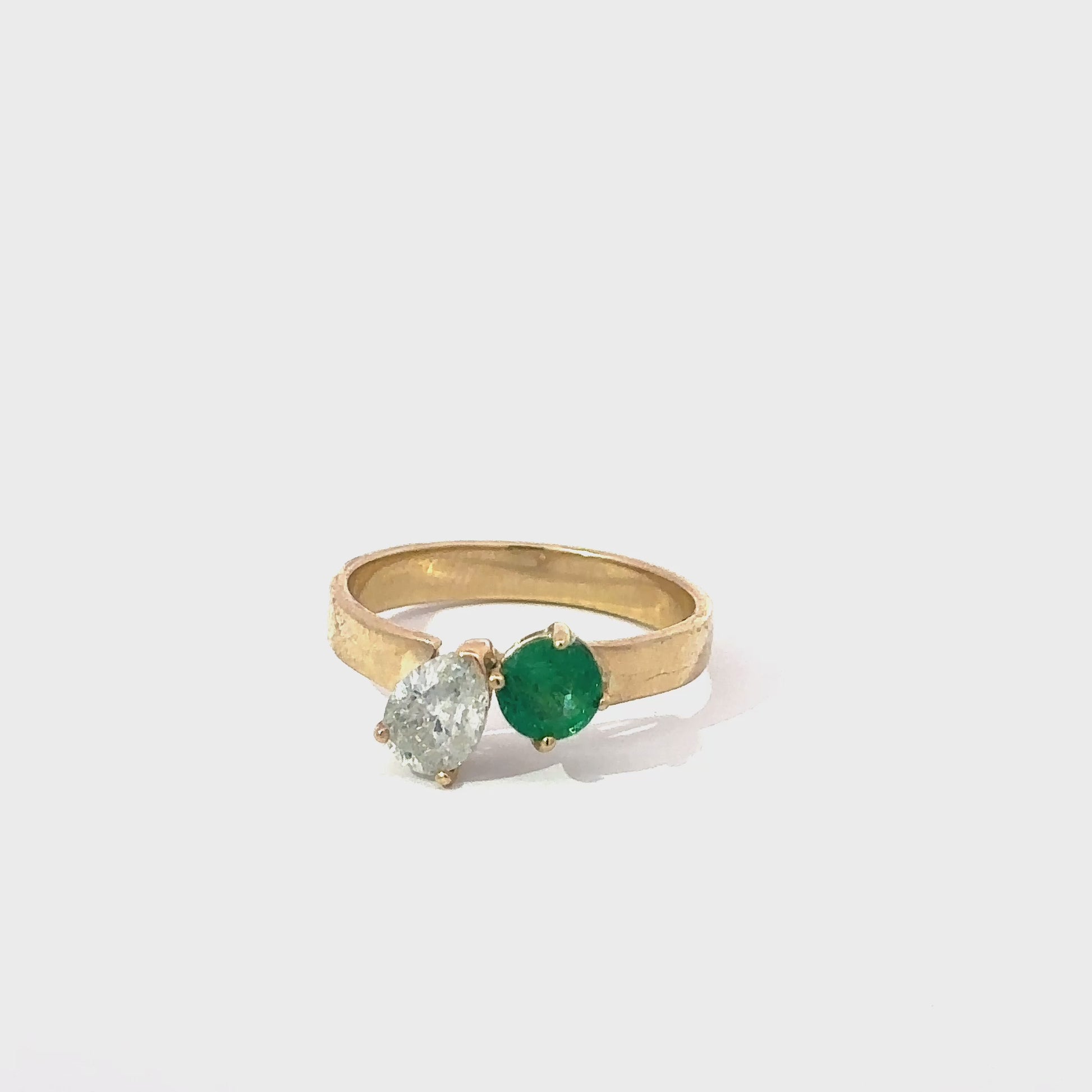 An SLV original design pear diamond and emerald toi et moi ring. Featuring an approximately .85ct natural pear shaped diamond - G-H Color I1 clarity set with a natural approximately .30ct round emerald in 14k yellow gold