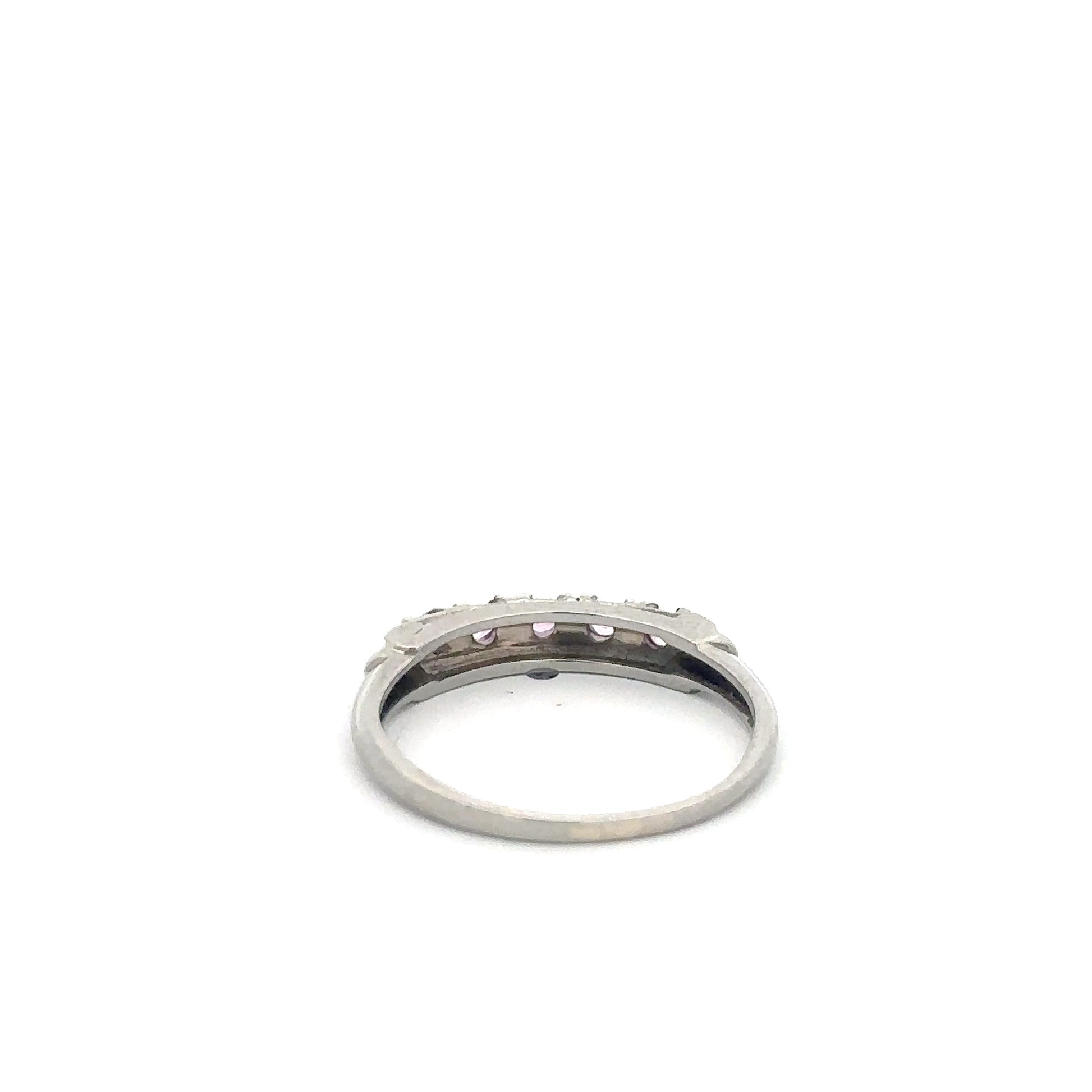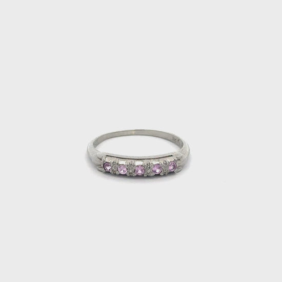 A vintage 18k white gold stacking band c featuring natural pink sapphires. Setting circa 1930s