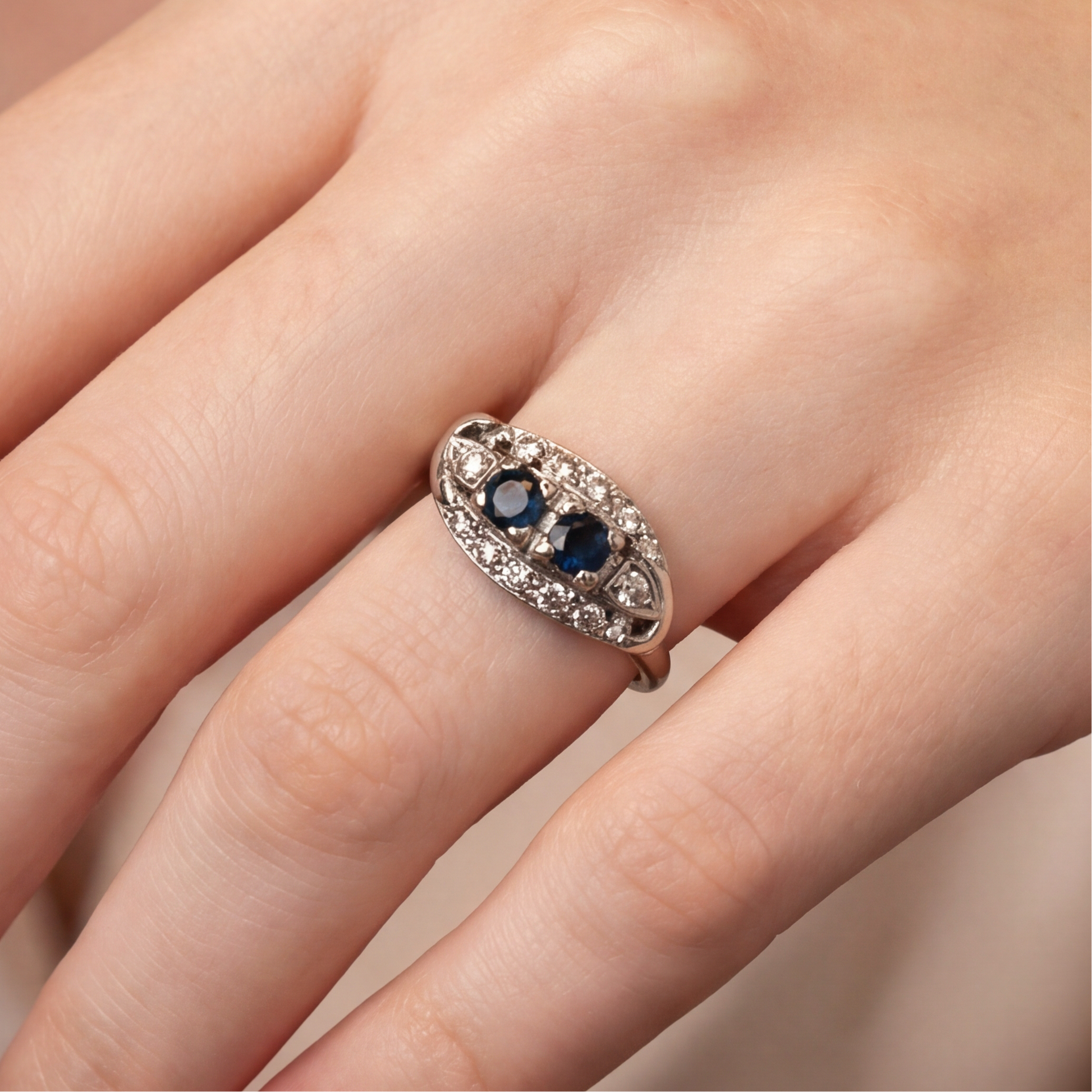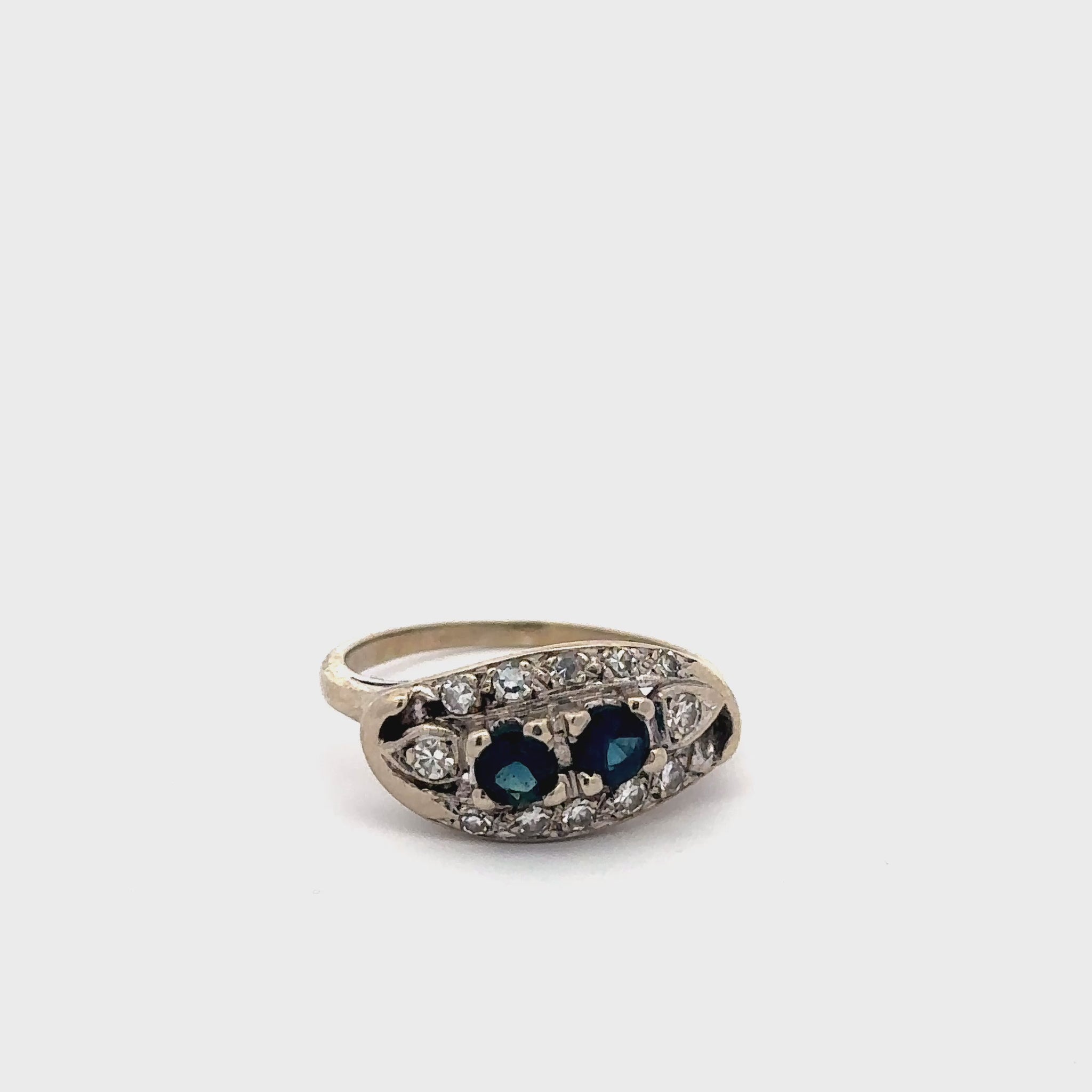 Vintage art deco sapphire and diamond cocktail ring. Featuring antique single cut diamonds and blue sapphires with a subtle teal hue set in 14k white gold.