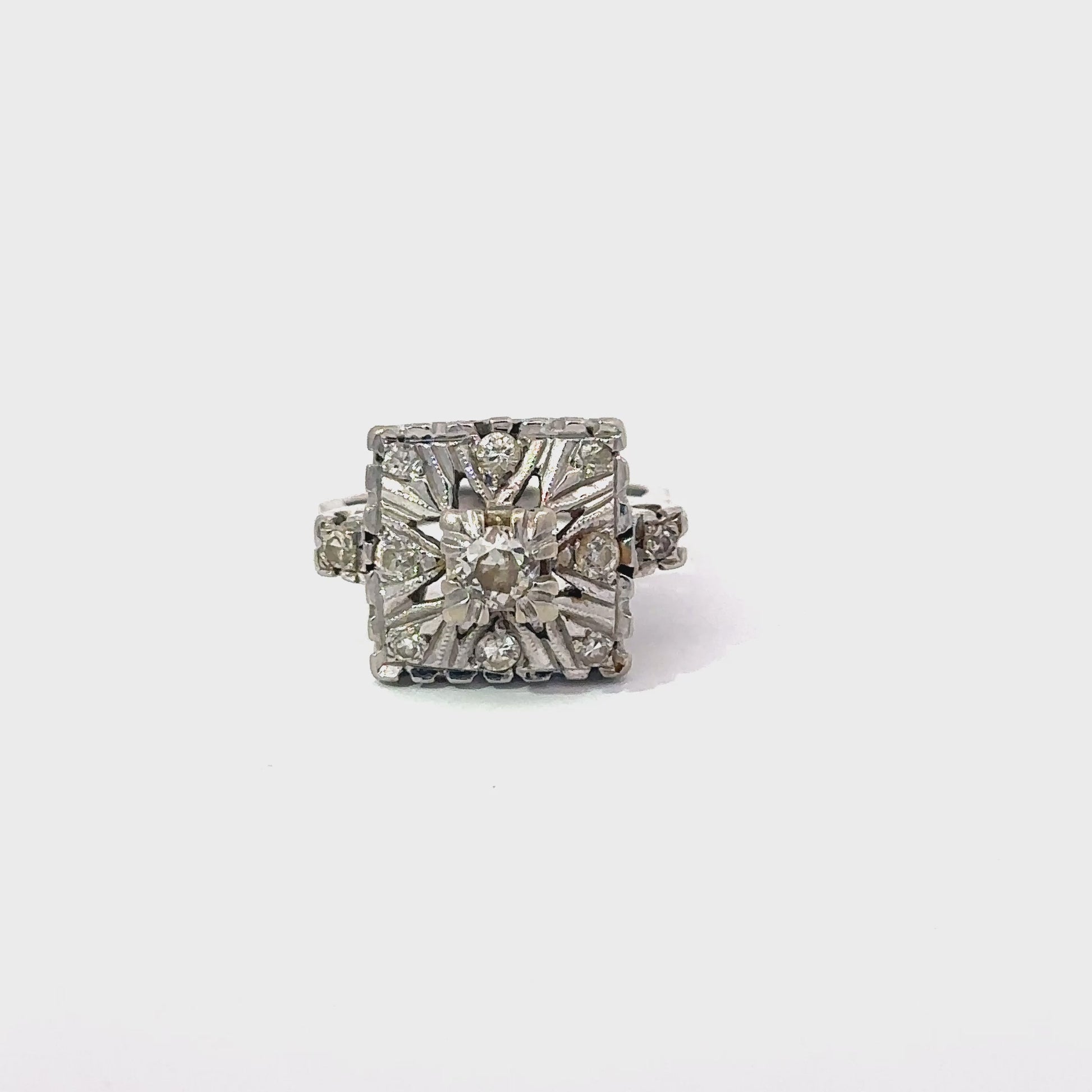 Vintage 1930s cocktail ring featuring natural diamonds and hand engraved detail. Center stone is approximately .25ct transitional cut diamonds surrounded by 10 approximately .05ct natural diamonds